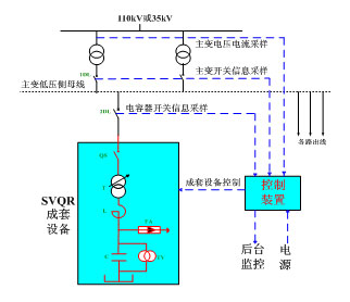 SVQR調(diào)壓式調(diào)無(wú)功變電站無(wú)功自動(dòng)補(bǔ)償裝置主要由一次部分和二次部分兩部分構(gòu)成。設(shè)備一次系統(tǒng)圖如下:
